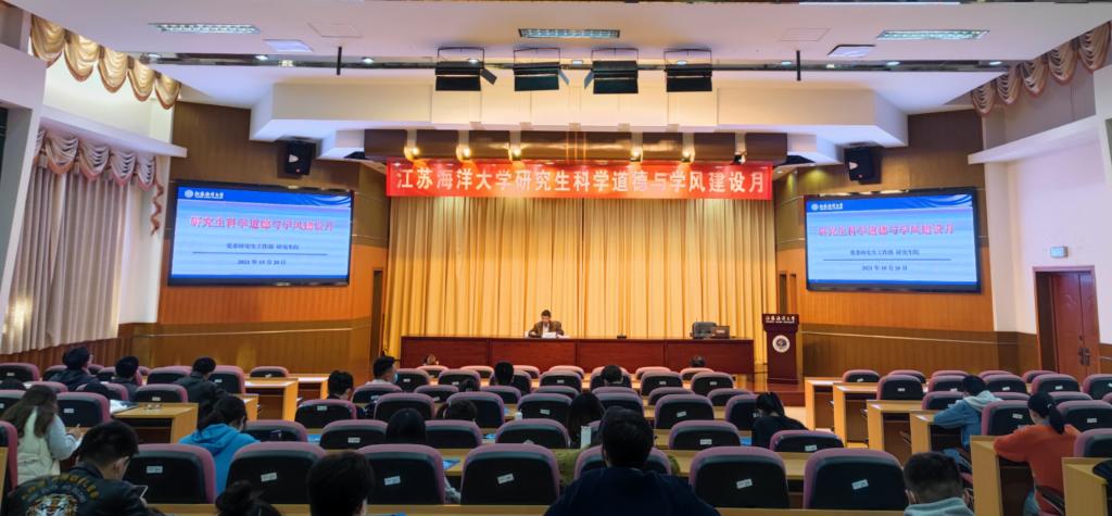 接下来,进行系列活动之一——校情和研究生教育管理规章制度宣讲,师生共同观看《江苏海洋大学宣传片——风从江海来》之后,研究生培养科科长孙克美老师介绍了研究生培养管理相关规定,并结合切身感受提醒研究生重视外语学习,养成爱锻炼、好读书的习惯,成为更好的自己;研究生学位科科长冯媛媛老师就研究生学位授予与学籍管理相关规定进行解读,重点介绍了学籍注册与变动、论文开题与抽检、学位授予流程等;研究生教育管理科伏晓姝老师为同学们介绍了大家非常关切的研究生奖助评优与违纪处理相关规定,鼓励同学们把端正学风、严谨治学统一起来,在刻苦学习中确立科学精神、锤炼品行情操,为母校建设添砖加瓦。