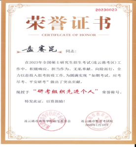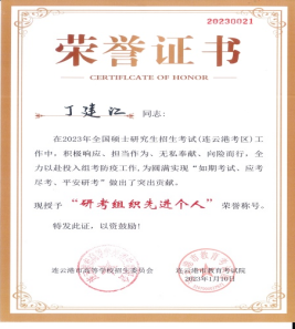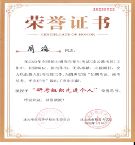 近日,连云港市教育考试研究院下发表彰通报,对2023年全国硕士研究生招生考试(连云港考区)研考组织先进个人进行表彰,我校盘赛昆、丁建江、周海、张玉霞4位同志被评为连云港市“研考组织先进个人”。