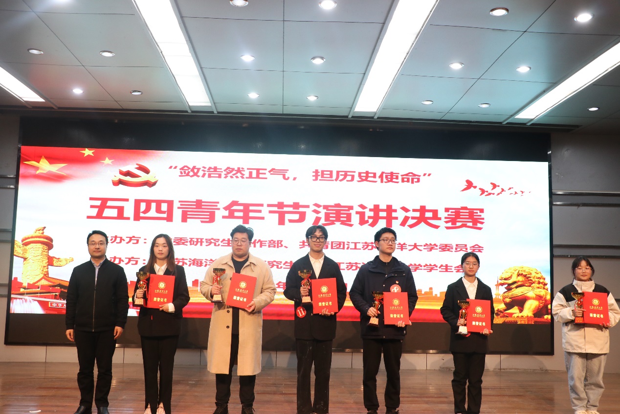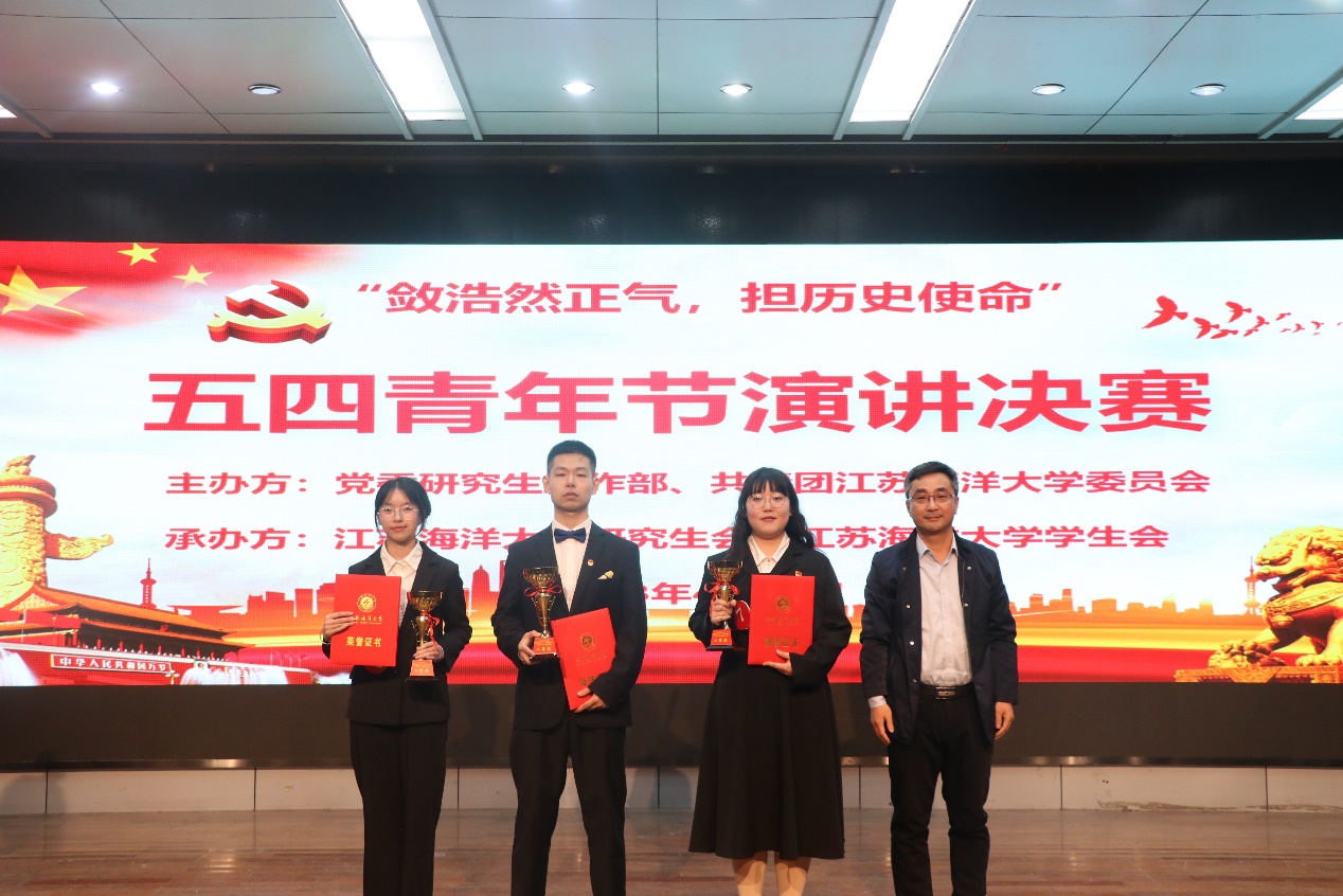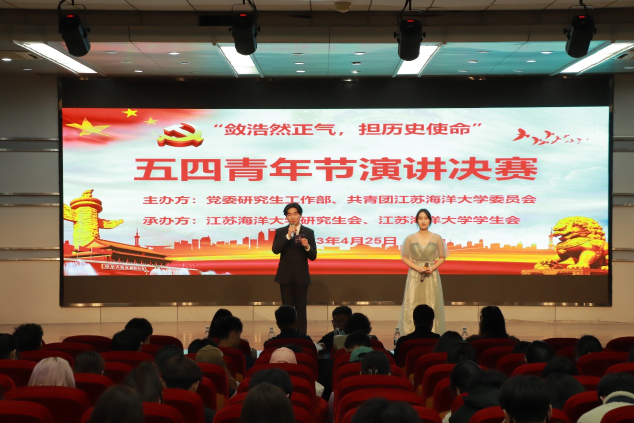 为迎接即将到来的五四青年节,让青年们进一步明白自己的历史使命,促进学生们努力奋进、心存浩然、勇于担当,425日晚上,由党委研究生工作部、共青团江苏海洋大学委员会主办,校研究生会、校学生会承办的“敛浩然正气,担历史使命”五四青年节演讲大赛决赛在艺术楼报告厅隆重举行。校党委常委、宣传部部长杨雪英,党委研究生工作部部长、研究生院院长陈书法,党委学生工作部部长、学生工作处处长、人民武装部部长陈德翼,校团委书记黄吉庆,校研究生会主席程钰和校学生会主席夏玥出席本次活动。部分青年教职工、研究生和本科生代表观看比赛。