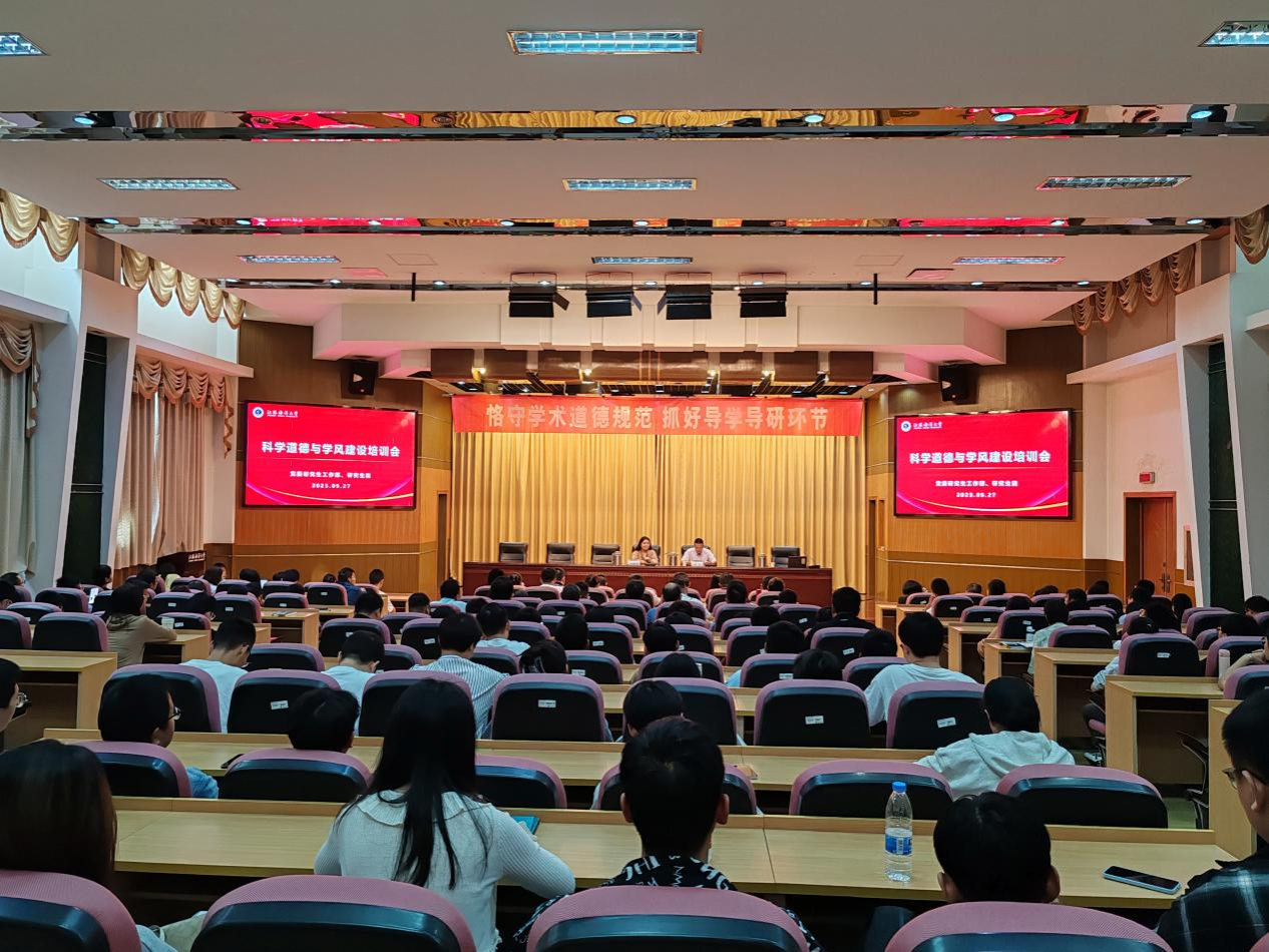 为深入学习贯彻党的二十大精神,全面落实贯彻习近平总书记关于弘扬科学家精神的重要指示精神,提升广大研究生的科研规范意识,杜绝学术不端行为,强化优良学风建设,9月27日下午,党委研究生工作部、研究生院组织我校2023级研究生和新聘导师在文博楼报告厅举办科学道德与学风建设专题培训,邀请中国知网研学平台事业部刘雨婷老师作了题为《恪守学术道德规范 抓好导学导研环节 数字化赋能研究生培养质量提升》专题报告。培训会由研究生院副院长高嵩主持。