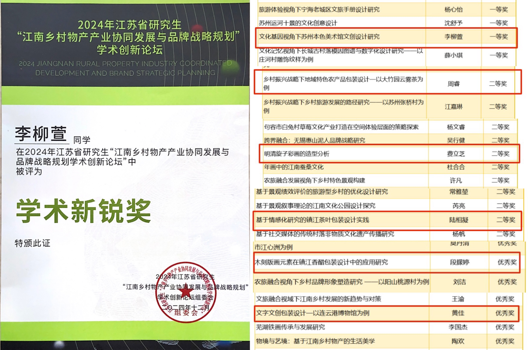 在本届江苏省研究生学术论坛,我校艺术设计学院7位硕士研究生入选优秀论文并获奖如下:23级研究生李柳萱荣获一等奖与学术新锐奖,23级研究生周睿、费立芝并24级研究生陆湘凝荣获二等奖,23级研究生黄佳、24级研究生段朦婷荣获优秀奖。
