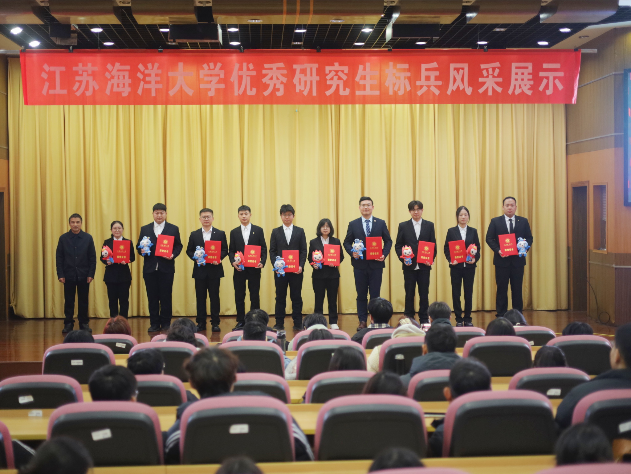 党委研究生工作部副部长、研究生院副院长秦海波对十位标兵取得的成绩与进步给予了高度肯定,赞扬他们坚定理想信念、潜心科研、热心公益,坚持德智体美劳全面发展且品学兼优,是全体研究生学习的榜样。希望我校广大研究生以标兵为榜样,汲取奋进力量、仰望星空、脚踏实地,把服务祖国发展、建设海洋强国作为使命担当,奋斗青春路、启航新征程。