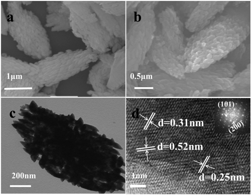 图10 (a-b) S-CePO4的SEM图像,(c) TEM图像,(d) HR-TEM图像。