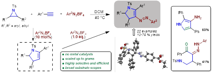 九、应用化学专业研究生荣静同学使用氮丙环、芳基末端炔与芳基四氟硼酸重氮盐为反应底物,经过三组分串联反应,高效、精准的构建了4-(芳基二氮烯基)-2,3-二氢吡咯衍生物。该方法不使用金属,反应条件温和,简便易行,可实现克级合成。鉴于偶氮化合物广泛应用于材料科学和有机合成,如染料、传感器、纺织品和催化剂配体等,方法将在化工、医药和纺织等领域有重要意义。该成果发表在Organic & Biomolecular Chemistry (2020, 18, 3149-3157)期刊上。