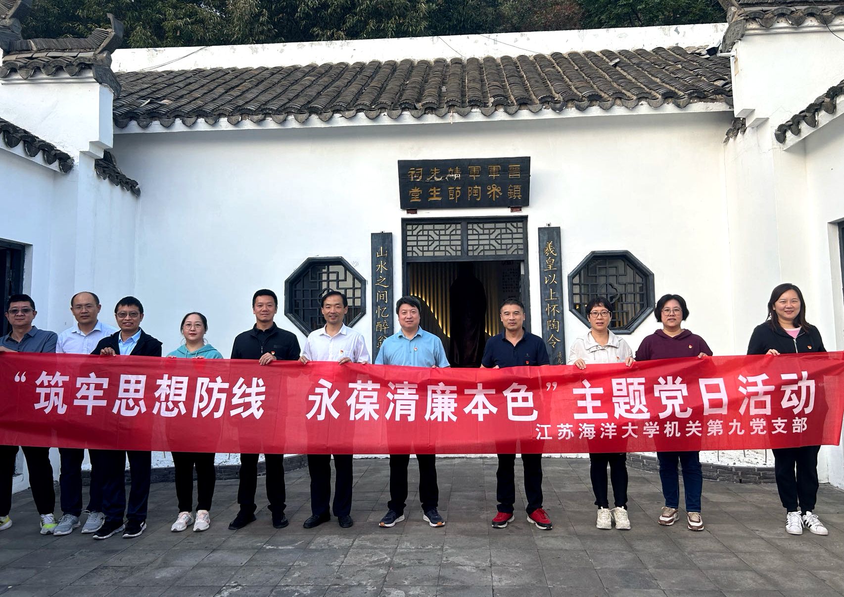 共建仪式后,机关第九党支部组织全体党员赴陶渊明文化园开展廉政教育参观学习。党员们跟随着讲解员的步伐,细细品味晋代诗人陶渊明廉洁齐家、守正不阿、勤政为民的故事,感受一代文豪淡泊名利、安贫乐道的思想和追求,实地接受了陶渊明注重家风、廉洁自律、坚持原则等清廉守节思想洗礼。大家纷纷表示,在今后工作中,时刻牢记党的宗旨,认真学习宣传贯彻中国共产党江苏海洋大学第一次党员代表大会精神,严守纪律底线,做到心中有党、心中有民、心中有责、心中有戒,履职尽责,在建设高水平应用研究型海洋大学的征程上自觉践行忠诚、干净、担当,展现机关干部职工良好形象。(伏晓姝/文 周冶/图  机关第九党支部)